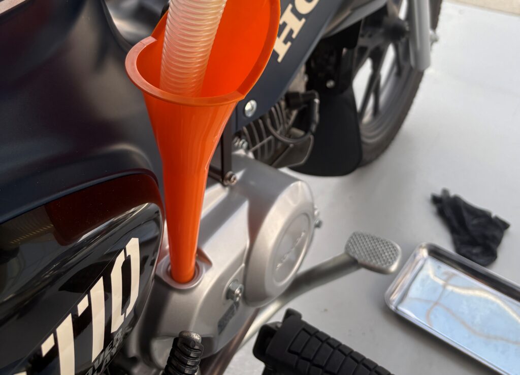 クロスカブのオイル投入口は天面を向いており、どんなオイル漏斗でも作業はしやすいと思います。