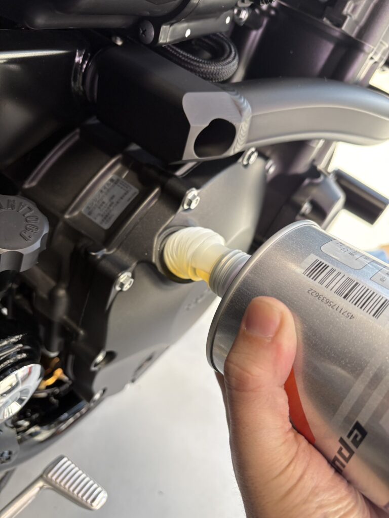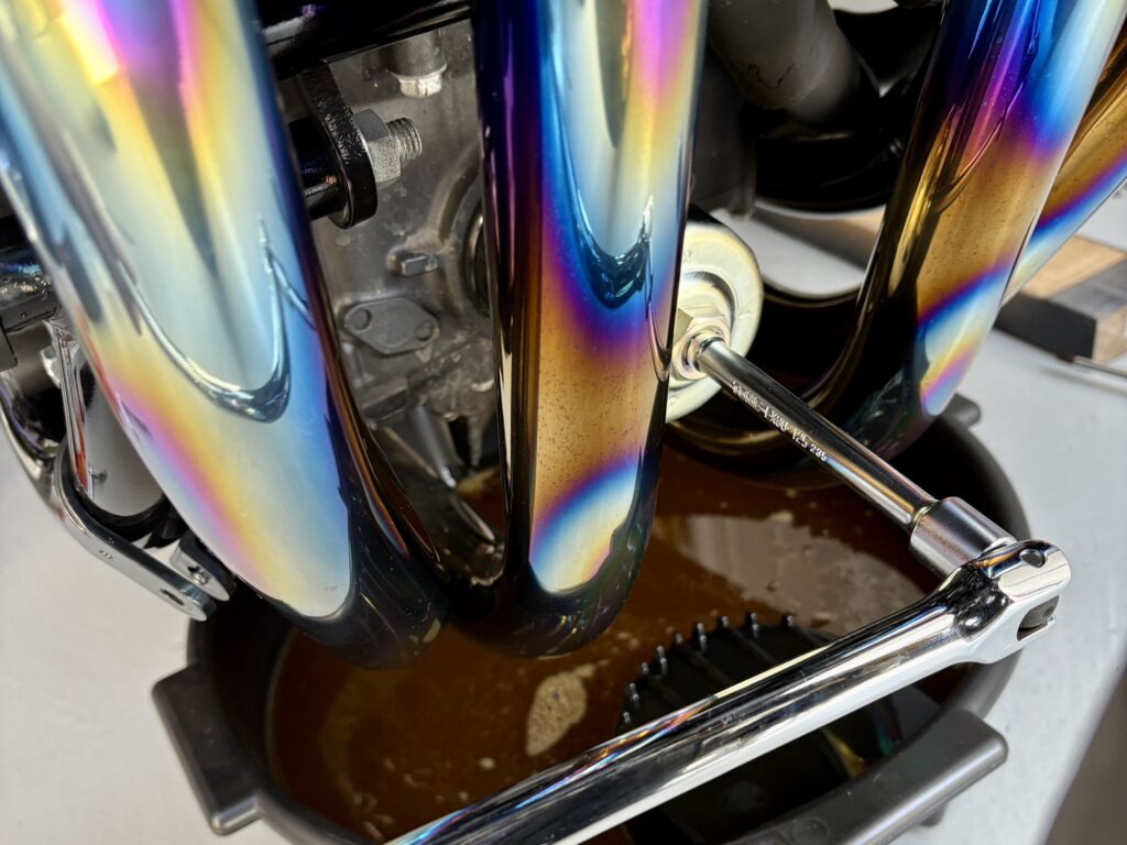 ボルトを緩めて古いオイルを排出し、消耗品を取り換えて、ボルトを締め込み、新しいオイルを入れます。