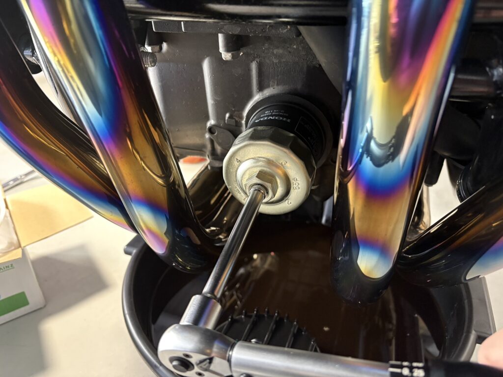 W65のフィルターレンチ+トルクレンチを使用し、26N・mで締め込みます。