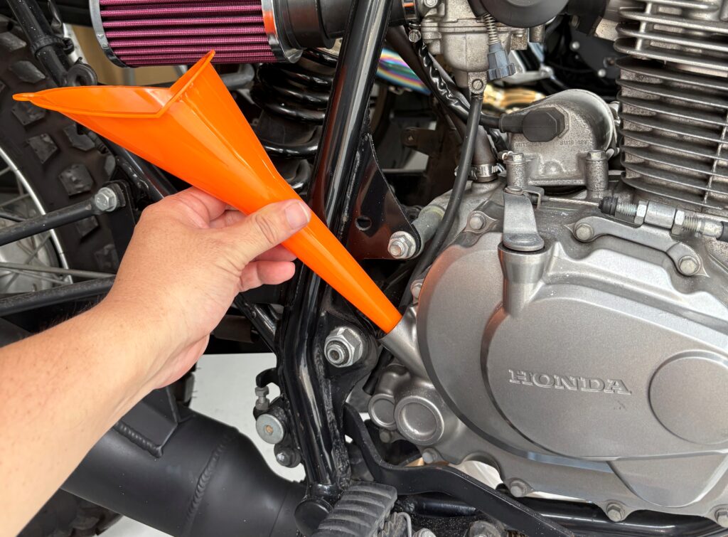 CB223Sのオイル注入口は斜め向きで少しオイルを入れにくいです。
