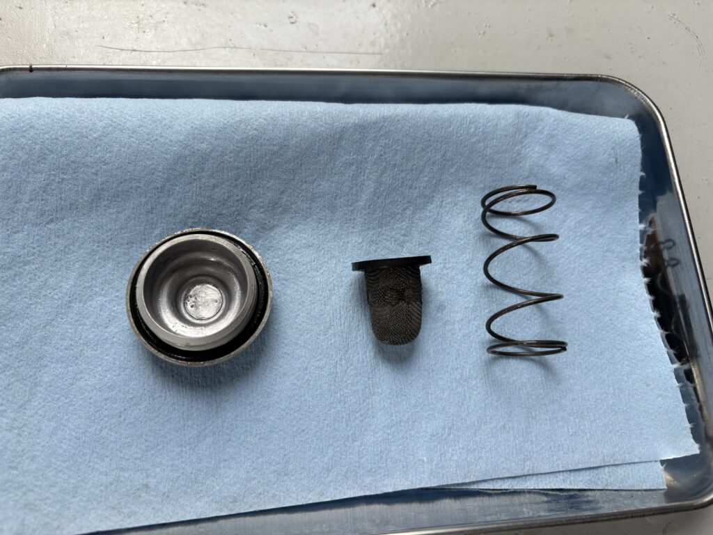 オイルの排出と部品の清掃が終わった後、スクリーンフィルター→スプリング→ドレンキャップの順で取り付けます。